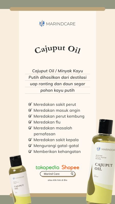 - Mengatasi perut kembung dan masuk angin: Perut kembung dan masuk angin seringkali membuat tidak nyaman. Sifat karminatif yang dimiliki Minyak Kayu Putih MarindCare ini bisa membatasi pembentukan gas serta menghilangkan gas yang sudah terbentuk di usus, sehingga perut kembung teratasi. Efek cineole juga membantu meredakan masuk angin.
