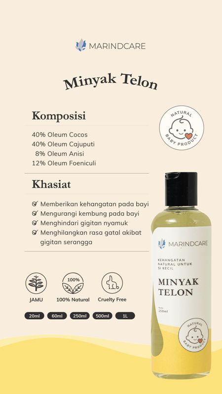 Minyak Telon dari MarindCare ini ditujukan khusus untuk bayi dan anak-anak yang diformulasikan dengan teknologi dan bahan terbaik sehingga aman digunakan untuk kulit bayi yang baru lahir. Aroma yang khas dari minyak telon MarindCare ini membuat buah hati semakin wangi dan juga hangat, terlindung dari masuk angin. Beberapa manfaat dari minyak telon sebagai berikut: